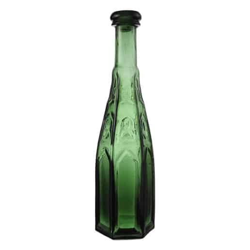 One of the earliest of the distinctly American bottle styles strongly identified with sauces was the Gothic or “cathedral” design. Glassmakers universally called this style Gothic as in Gothic pepper sauce and the term “cathedral” really does not appear in glassmakers catalogs as this designation is more of a modern era name. These designs originated during the mid-19th century Gothic Revival period in America and Europe which also had its effects on the architecture of the period. This style all share the distinction of having varying sized peaked “church window” like panels on most or all of the sides. We have many early Gothic or cathedral pickle bottles in our museum.