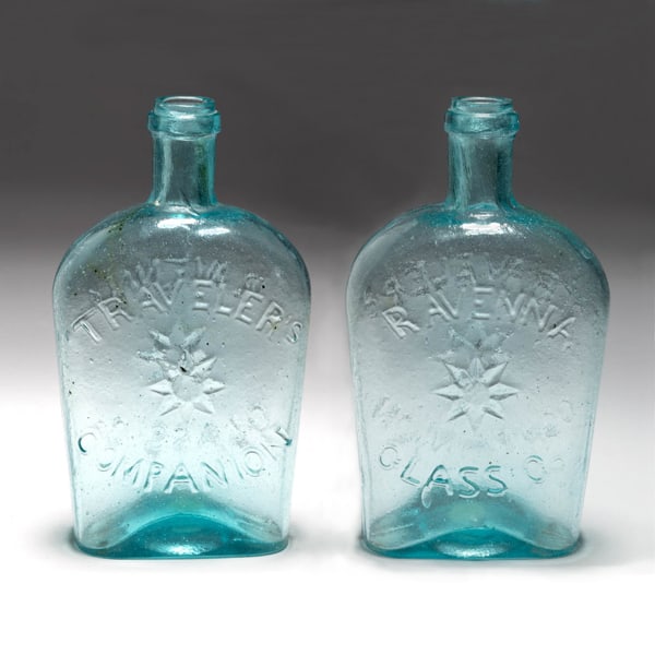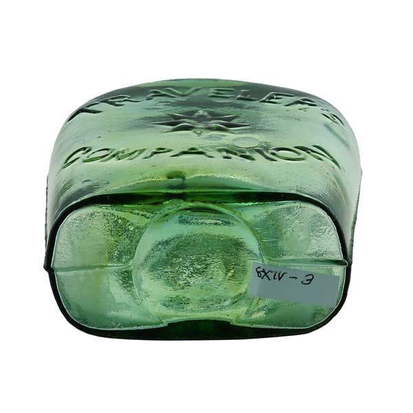 Support Image: Auction Lot 236: GXIV-3 TRAVELER’S COMPANION – RAVENNA FLASK, pint, obverse embossed “TRAVELER’s / (star) / COMPANION”, reverse embossed “RAVENNA / (star) / GLASS Co”, applied flat collar below the plain mouth, plain base with concave center. aquamarine, Ravenna Glass Works, Ravenna, Ohio. Circa: 1860-1880. Undamaged except for a very minor flake to edge of mouth. Size: 7″ H. From the estate collection of Russell and Doris Evitt, Jackson, CA., McKearin/Wilson – American Bottles & Flasks, p. 672. – Jeffrey Evans, Jeffrey S. Evans & Assoc., February 28, 2020