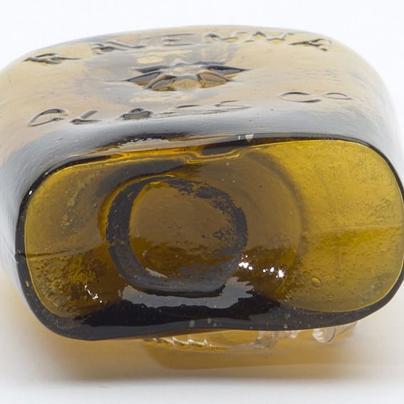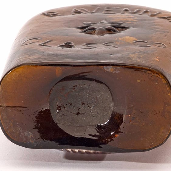 On the reverse side of the flask is a similar graphics layout as on the obverse. The embossed word ‘RAVENNA’ is presented in a convex arc over an embossed ‘GLASS Co’ in an opposite similar concave manner to create a “football” shape. The “o” in “Co” is smaller. The ‘R’” has a knee and short foot. There is a centered embossed star shape formed around a circle. Eight triangular shapes create the compass rays of the star.