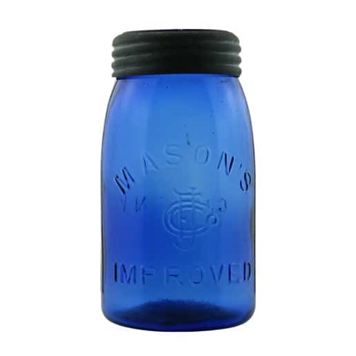 Our quart cobalt blue “Mason’s CFJCo Improved Clyde N.Y.” jar is a sight to behold as it would dominate shelf space and demand attention in any collection. The jar is legendary and has been featured in at least two older bottle magazine articles. We are pleased to have it on display in the museum.