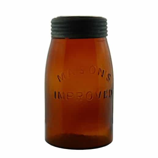 This Mason’s Improved quart jar in amber is unique. The jar has ‘MASON’S’ embossed in an arch over a straight-line ‘IMPROVED’ on the face of the jar and ‘PATENTED MAY 10 1870’ embossed on the bottom. It is hand-blown with a ground lip. The closure is a top seal, straddle lip glass lid with a zinc screw band. The maker is unknown. Although these jars have a shoulder seal finish, they are embossed “Mason’s Improved.”