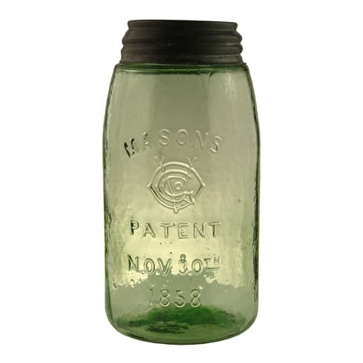 Our “Masons OVGCo (monogram) Patent Nov 30th 1858” jar is extremely rare as the jar is typically found in aqua with exceptionally rare examples reported in olive-amber and apple-green like our museum example.