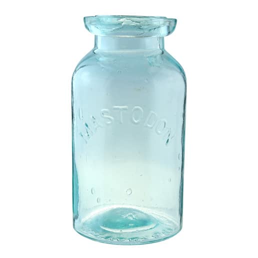 This rare aquamarine quart is a hand-blown, tooled applied lip, wax sealer jar with a grooved ring for a metal cap and wire clamp. The jar is embossed ‘MASTODON’ in an arc on the face. The Mastodon was made by T. A. Evans & Co. in the early 1860s in Pittsburgh, Pennsylvania. The jar is base embossed in a circle comprised of a convex and concave arc reading ‘T A EVANS & CO’ and ‘PITTSBURGH PA.’ There is an embossed ‘A’ in the center of the base.
