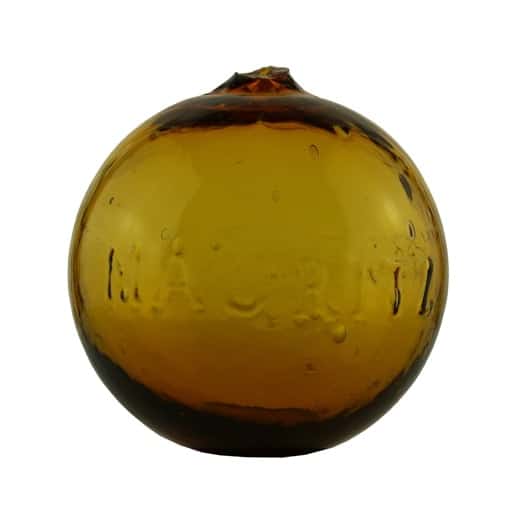 Support: Auction Lot 788: “MAURITZ – WIDFORS” Target Ball, Sweden, 1875 – 1900. Beautiful, light honey amber, 2-piece mold, rough sheared mouth, dia. 2 5/8”, perfect. A very pretty target ball, nice light color, and with plenty of small bubbles throughout. Very rare, believed to be perhaps a dozen or so examples known. – The Ralph Finch Collection of Target Balls, Traps and Shooting Ephemera, An Absentee Auction in Six Parts – 2017-2019, John Pastor, American Glass Gallery