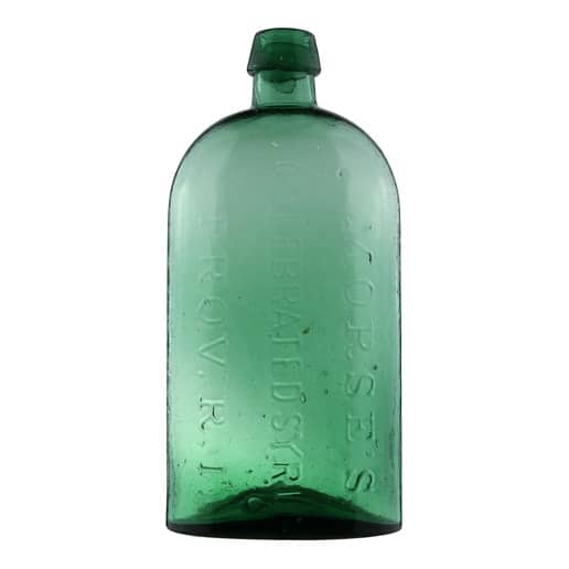 In a beautiful clear medium emerald green glass, this robust oval medicine is embossed ‘MORSE’S CELEBRATED SYRUP PROV. R. I.’ vertically, shoulder to base, in three lines on one side of the bottle. The name is embossed in a strong serif typestyle with high kickup “R’s.” The last letter “P” in “Syrup” runs right into the base of the bottle. There is an applied sloping collar and an iron pontil scar. The bottle is 9″ inches tall and is in excellent condition with a nice pebbly, whittled, glass texture. There is an interesting in-making glass fold located on the reverse side base. An American Glass Gallery, Lot 224, Auction #16 sticker is on the base.