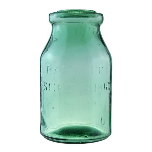 Our quart, apple green “Patent Sept. 18, 1860” jar (SFJR #1036) is hand blown with a ground lip. The closure is a wax seal with a grooved ring pressed into the neck that would have used a metal cap. The jar is face embossed in two centered horizontal lines with a serifed typestyle. The first line reads, ‘PATENT,’ and the second line reads, ‘SEPT. 18. 1860.’ The base is unmarked.