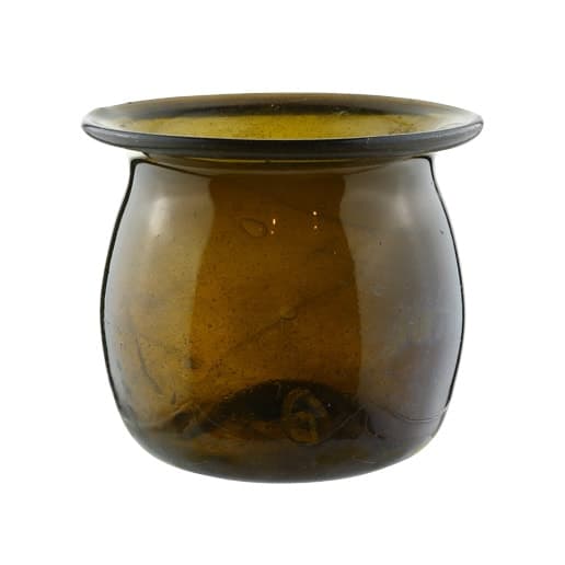 Our 4″ high by 5″ wide cylindrical, dark yellow-olive sugar pot is an early free-blown tableware piece that is extremely rare. The bowl or pot is possibly from the Pitkin Glass Works, a name used by Pitkin glass authorities and collectors, in East Hartford (now Manchester), Connecticut based on similar shards that have been excavated at the site which is now a historical landmark. The pontiled piece, with a wide-rolled lip, was probably made somewhere between 1815 and 1830.