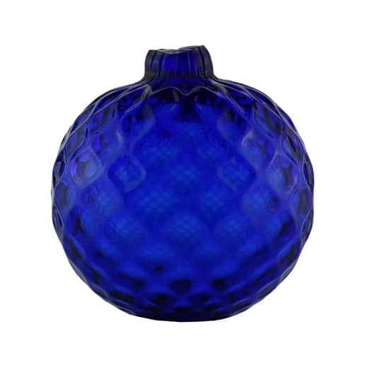 The target ball is in a medium-to-deep cobalt blue glass color with a quilted diamond pattern. There is no embossed copy and no discernible mold seams but it was likely blown in a 2-piece mold. It has a sheared neck and is 2-5/8” in diameter and in perfect condition.
