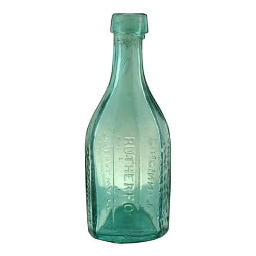 Our decadon or 10-sided deep aqua bottle is embossed, ‘RUTHERFORDS’ (side 1), ‘PREMIUM’ (side 3), ‘MINERAL WATER’ (side 5), ‘CINCINNATI’ (side 7), and ‘THIS BOTTLE IS NEVER SOLD’ (side 9). All of the other panels are blank. There is an applied tapered mouth and a deep iron pontil cavity. The bottle is considered very rare.