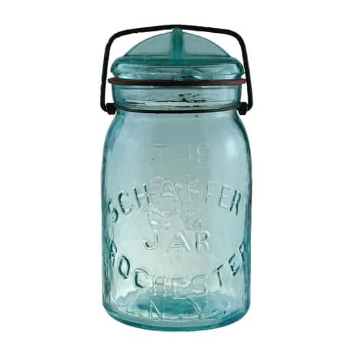 Support Image: Auction Lot 14360: THE SCHAFFER JAR ROCHESTER N.Y. Quart. Aquamarine, Closure original domed glass lid and original wire clamp assembly. Trace of content haze. Edge flaking on the ground mouth with some not yet detached. Base: “1”, late 1800’s – Greg Spurgeon, North American Glass, April 2017