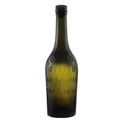 On the face of the bottle is embossed copy reading ‘SHRIVER’S’ in an arch over three lines of copy reading, ‘OYSTER’ (2nd line), ‘KETCHUP’ (3rd line), and ‘BALTIMORE’ (4th line). A paper label would have gone on the reverse side of the bottle. No example of a bottle with a surviving label is known.