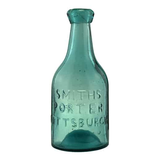 In describing our porter-style bottle, we see that it is in a blue-green aqua glass that measures 7 ¼ inches tall. It has an iron pontil with an applied inverted tapered mouth. The bottle is embossed on one face ‘SMITHS PORTER PITTSBURGH’ in three stacked centered lines.