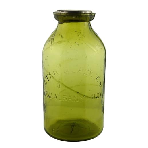 Immediately upriver was the Star Glass Company, which was owned by the same John B. Ford and Washington C. DePauw, a local businessman, and cousin of Fords. They had started these glassworks around 1869 primarily for the purpose of manufacturing rough and polished plate glass, window glass, and fruit jars. This included our wax sealer fruit jar embossed in two lines ‘STAR GLASS CO.’ and ‘NEW ALBANY, IND.’ The “Star Glass Co.” copy is arched in a serifed typestyle over a centered sans-serif “New Albany, Ind.” in a horizontal straight line.
