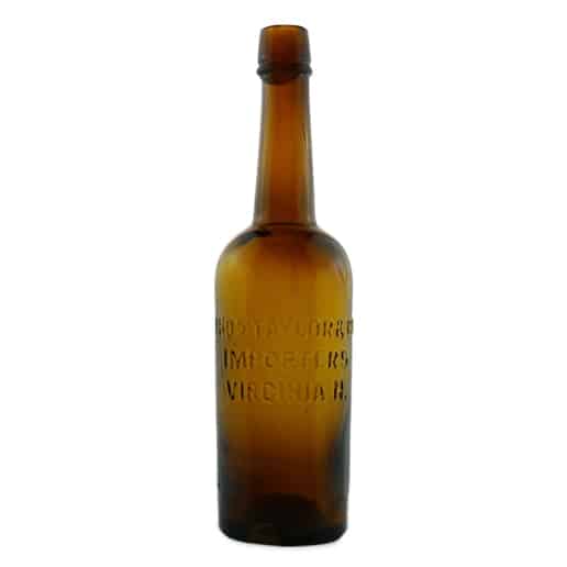 We have two examples of embossed ‘THOS. TAYLOR & CO. IMPORTERS – VIRGINIA, N.’ bottles in our museum. The olive green example is actually a sixth in size and is extremely rare. See Thos. Taylor & Co. (Sixth). Our museum example here is a fifth in size and is almost as rare. Virginia City, Nevada bottles are cherished by collectors as they exude the “Gold Rush” era of America.