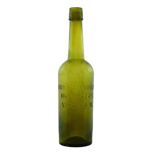 The “Thos. Taylor & Co., Importers Virginia, N.” is an early applied top cylinder that is a sixth (6th) in size compared to the traditional fifth (5th) or quart (4th) bottles. In a beautiful olive green glass coloration, it pairs nicely with our museum example of an amber fifth Thos. Taylor & Co. bottle. There is also a slug plate Thos. Taylor Co. bottle that came a little bit later. Two examples are pictured above.
