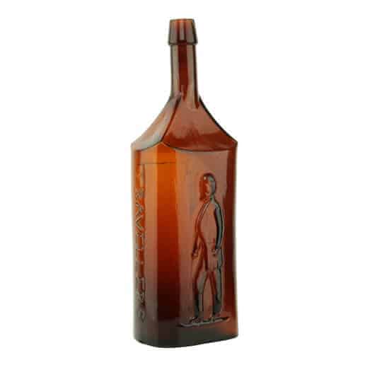 This rather interesting bottle presents a large figure of a man walking and at 10-½” tall, makes for a striking bottle when displayed. The rectangular form has a graceful convex soft radius on the front panel with a prominently embossed, fully dressed man with a beard and hat walking to his left on a spot of ground. He has a walking stick or a sword in one hand. The reverse panel is concave with an inset vertical panel for where a paper label might have been placed. The left convex side panel has the word ‘TRAVELLERS’ embossed shoulder to base while the right-side panel has ‘BITTERS’ embossed shoulder to base. The front and back shoulders are triangulated with soft radius sides leading into a rather long neck that cuts into the pitched shoulders. There is an applied long tapered mouth and the base is smooth. Embossed rather crudely in two stacked lines on the back shoulder panel are the dates ‘1834’ and ‘1870.’ The ‘4’ is embossed backward.