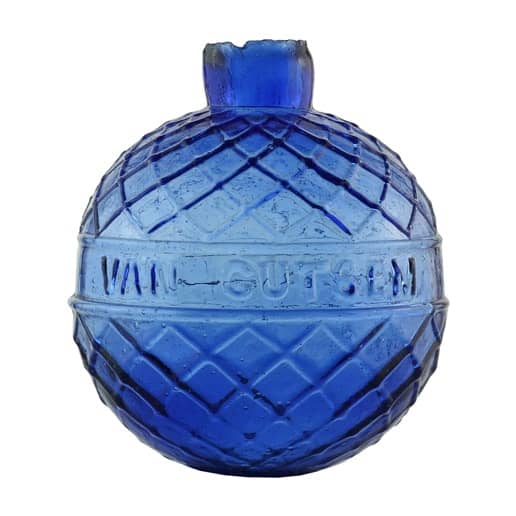 Secondary Image: Auction Lot 579: “VAN CUTSEM – A ST QUENTIN” Target Ball, France, 1875. Cobalt blue, quilted diamond pattern above and below center band, 3-piece mold, rough sheared mouth, dia. 2 5/8”, perfect. A beautiful example, very light in tone through the center, with some striations and deeper cobalt color through the shoulders and base. In 1994, barrels of these balls were found in the basement of an old estate. They are now beginning to “dry-up”. – The Ralph Finch Collection of Target Balls, Traps and Shooting Ephemera, An Absentee Auction in Six Parts – 2017-2019, John Pastor and American Glass Gallery