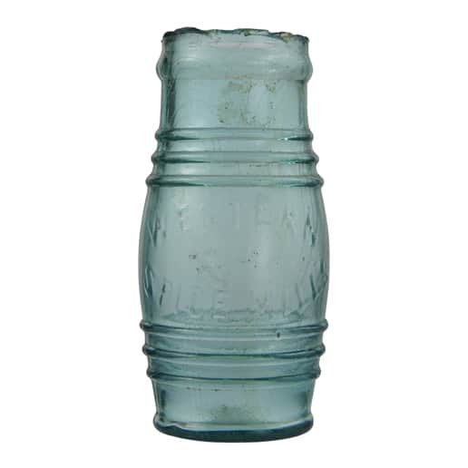 These figural barrel mustard bottles typically have three molded rings or bands above and below the central copy and label area. Other conformations ranging from two to at least six rings have also been recorded as well as some with vertical staves. Most examples have rings that are separated by a distinct space, as opposed to figural bitters barrels that use tight rings.