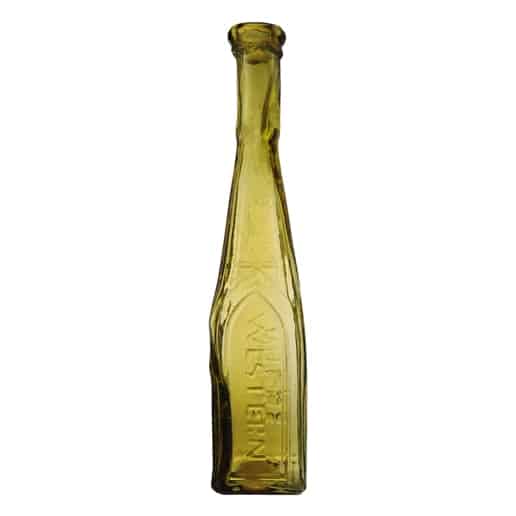 Our museum example of a 9″ x 2″ square citron Western Spice Mills pepper sauce bottle is Gothic in design, has a square but a slightly askew body with narrow chamfered corners, tall tapered shoulders with a lattice motif leading to a slender, plain cylindrical neck with a round collar mouth that was rather sloppily applied. The base is smooth and has a depressed circular area. The four sides are framed sunken plain Gothic arches. Embossed within three of the Gothic windows are the brand words ‘WESTERN,’ ‘SPICE,’ and ‘MILLS.’ The fourth window is blank and is where a paper label would have been placed. The capacity is 7 ounces. The bottle is very rare in shades of yellow and is usually found in aquamarine.